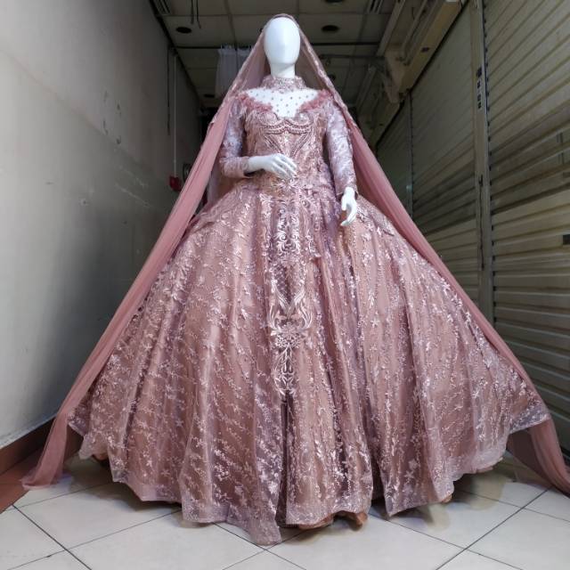 Jual Gaun Kebaya Pengantin Muslimah Ld 110 Set Slayer Rose Gold